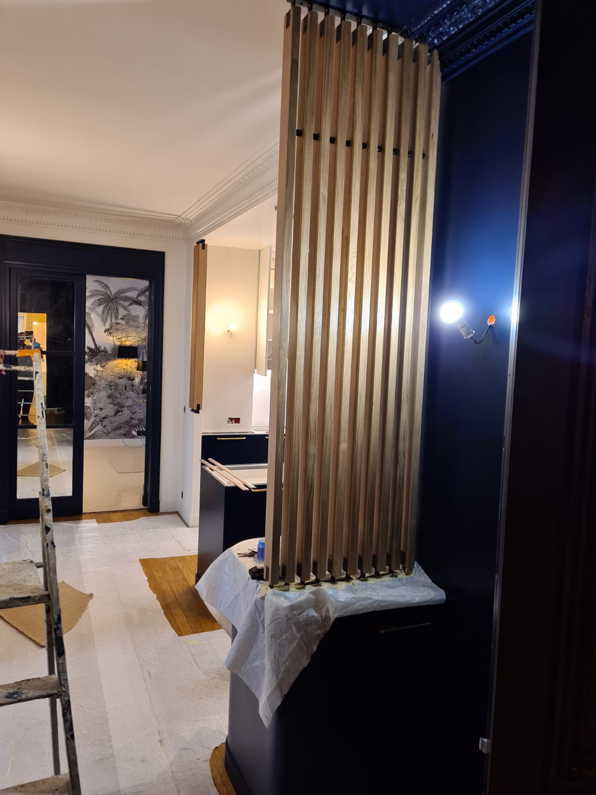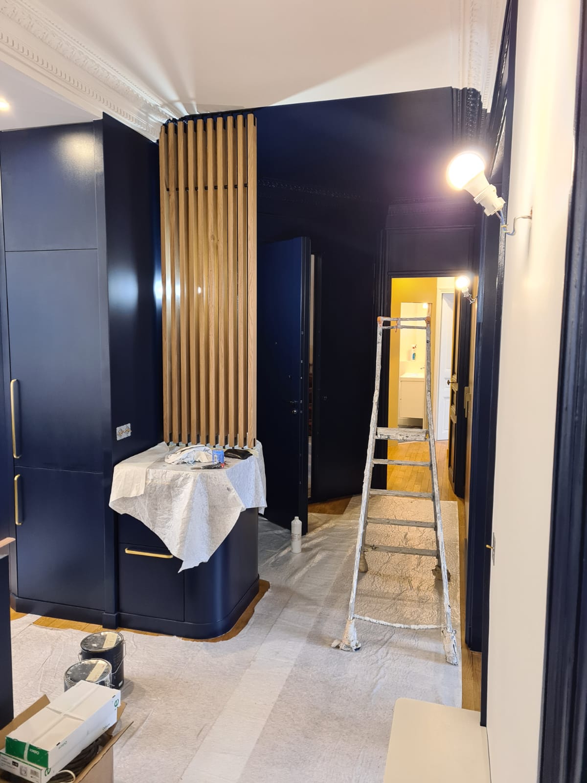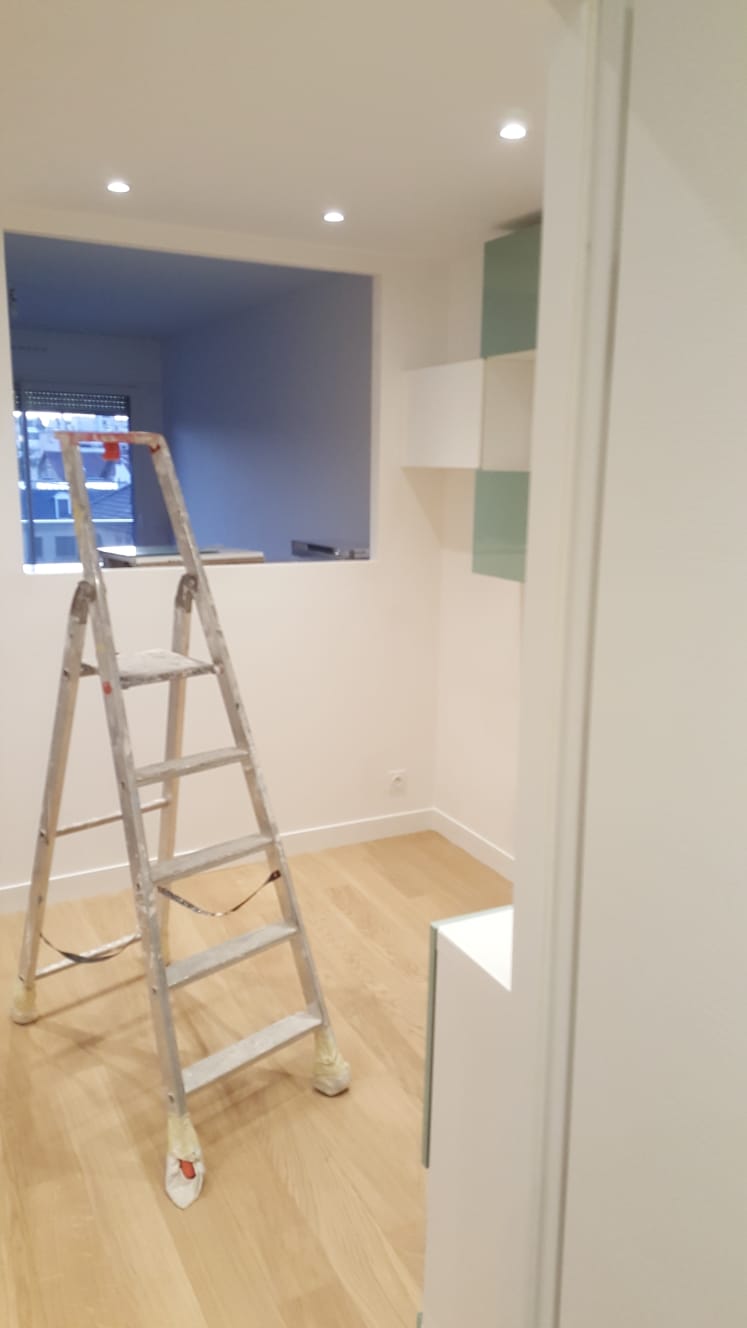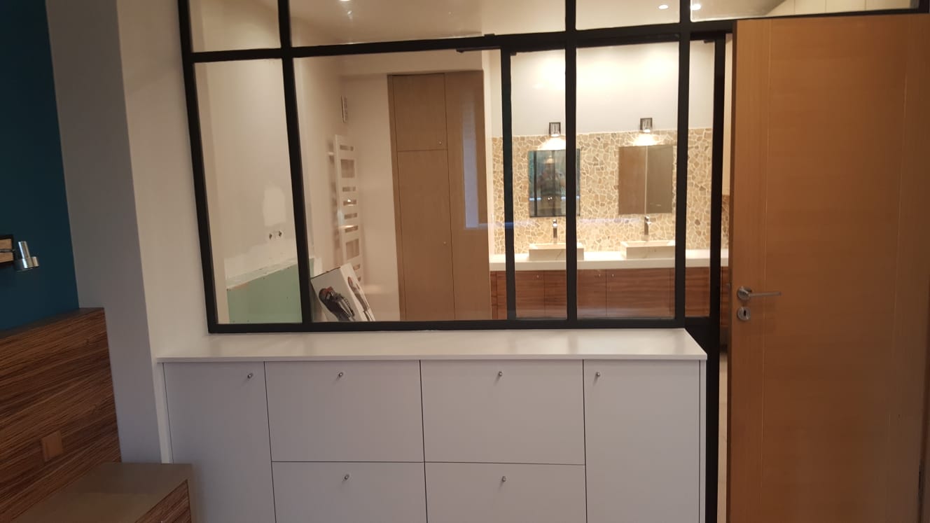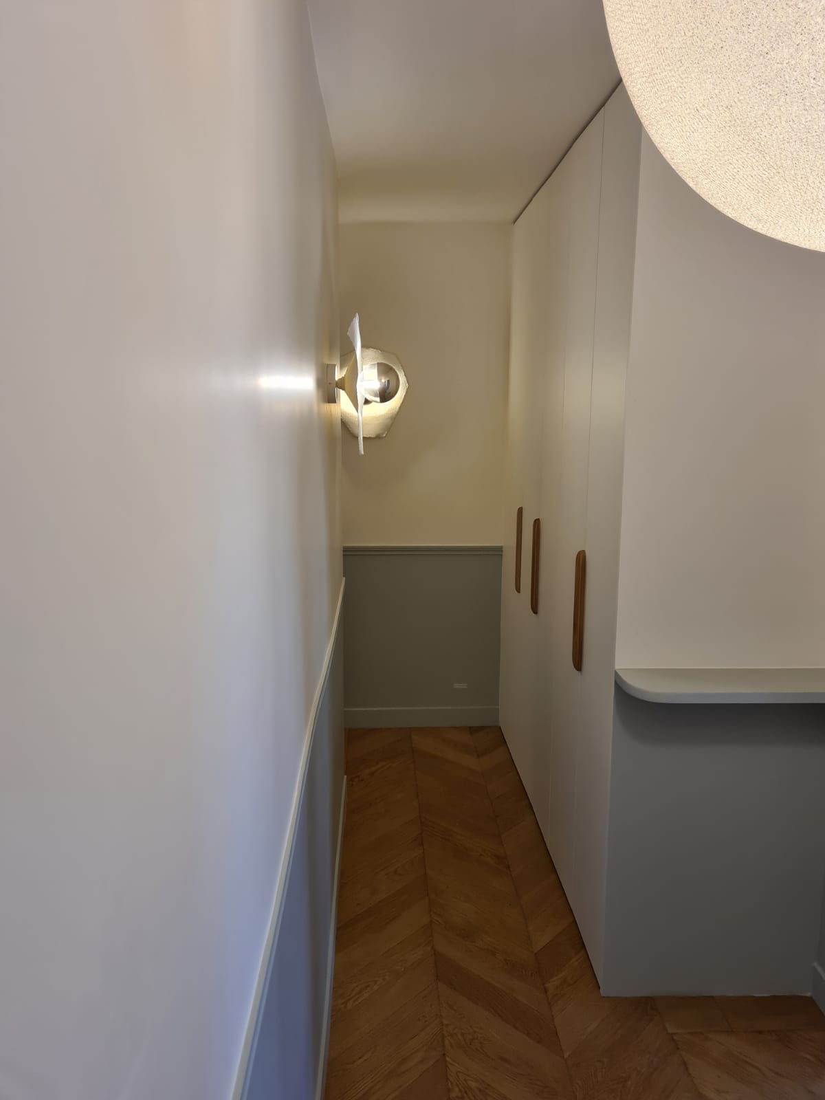 Un magnifique ensemble de menuiserie en surélévation vous donne une idée précise sur nos capacités de réalisations. La qualité de pose du carrelage et du parquet sont la marque de notre savoir faire. La finition et les peintures mettent en lumière le soin apporté par nos peintres. Vous constaterez que toute l’électricité est encastrée, ce qui donne toute sa dimension à une décoration appropriée.